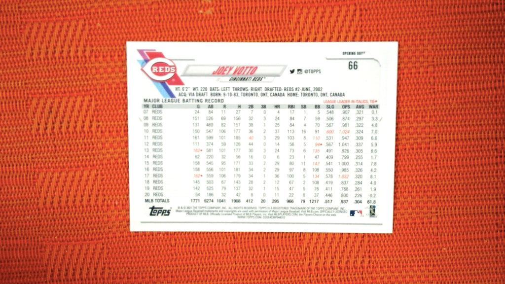 This is a nice example of a 2021 Topps Opening Day #66 Joey Votto Opening Day Edition.