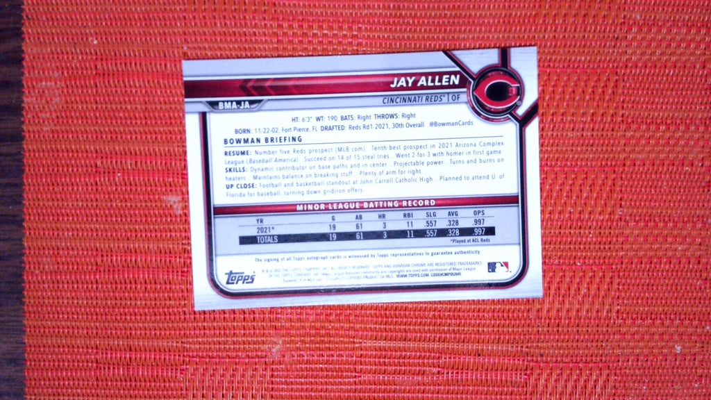 This is a nice example of a 2022 Bowman #BMA-JA Jay Allen Chrome Prospect Autographs Mojo Refractor.