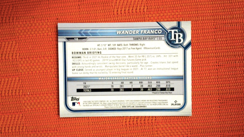 This is a nice example of a 2022 Bowman Chrome #10 Wander Franco Fuchsia .