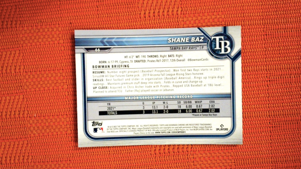 This is a nice example of a 2022 Bowman Chrome #66 Shane Baz .