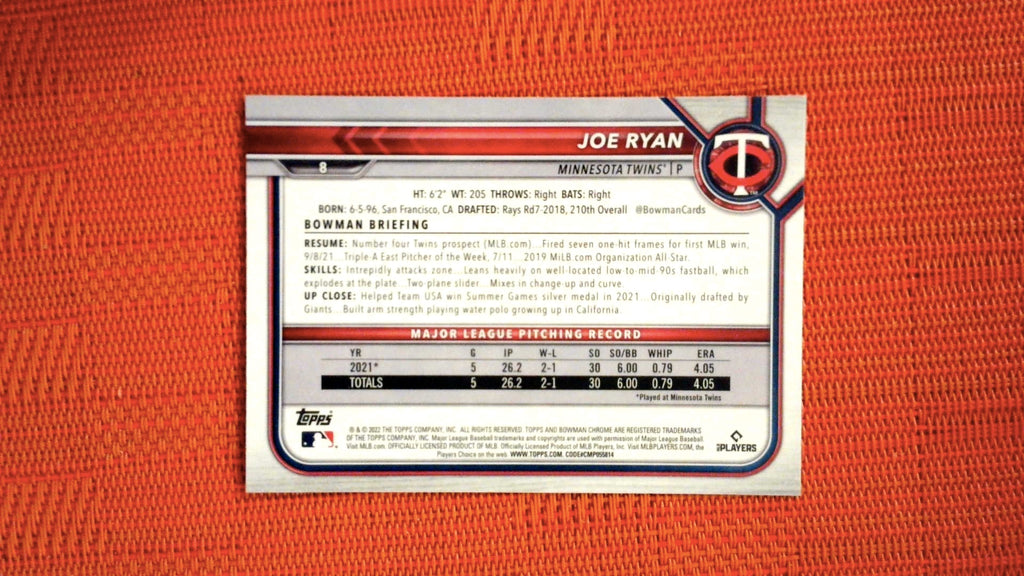 This is a nice example of a 2022 Bowman Chrome #8 Joe Ryan .