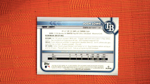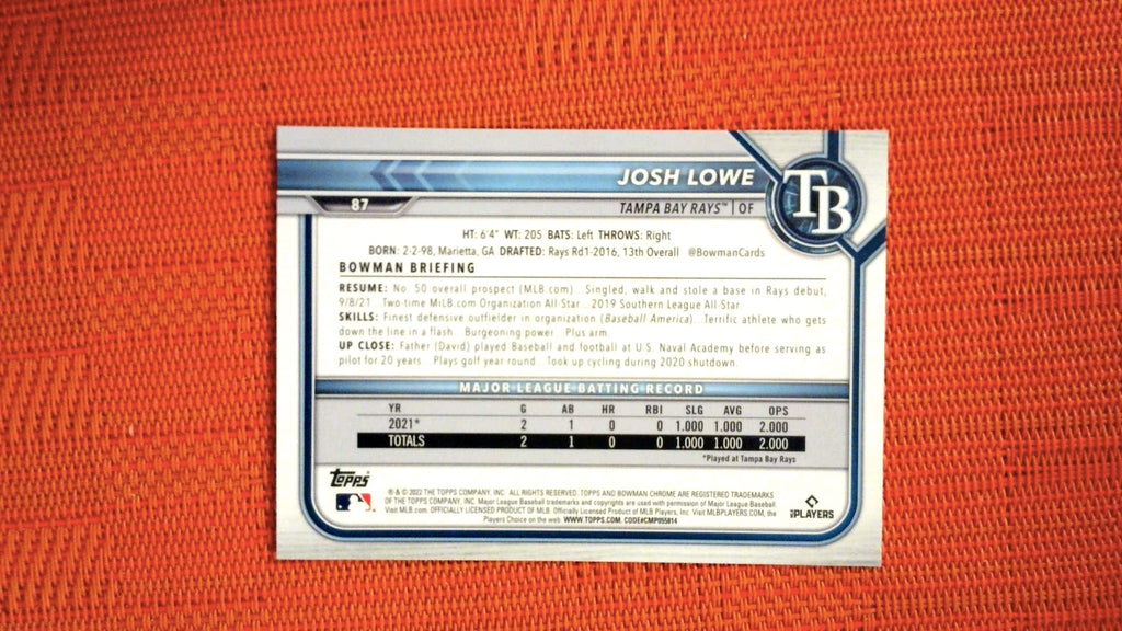 This is a nice example of a 2022 Bowman Chrome #87 Josh Lowe .