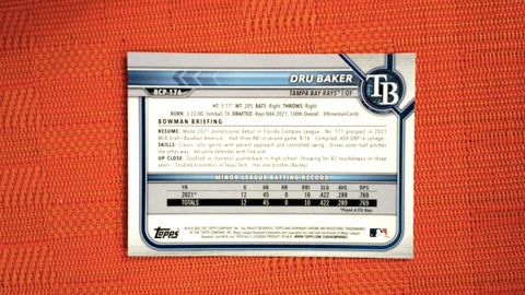 This is a nice example of a 2022 Bowman Chrome #BCP-176 Dru Baker Prospects.