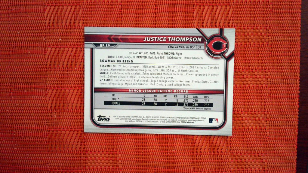 2022 Bowman Neon Green Border #BP-59 Justice Thompson 256/399 Baseball