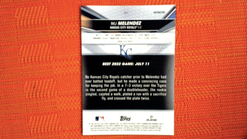 This is a nice example of a 2022 Bowman's Best #17 MJ Melendez Refractor.