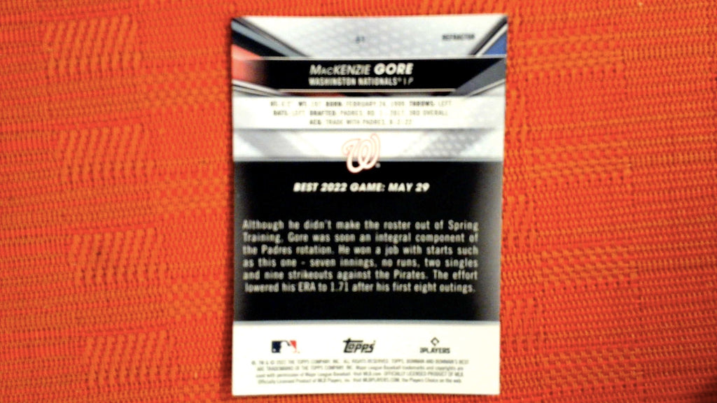 This is a nice example of a 2022 Bowman's Best #61 MacKenzie Gore Refractor.