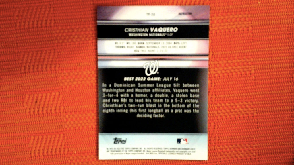 This is a nice example of a 2022 Bowman's Best #TP-26 Cristhian Vaquero Top Prospects Refractor.