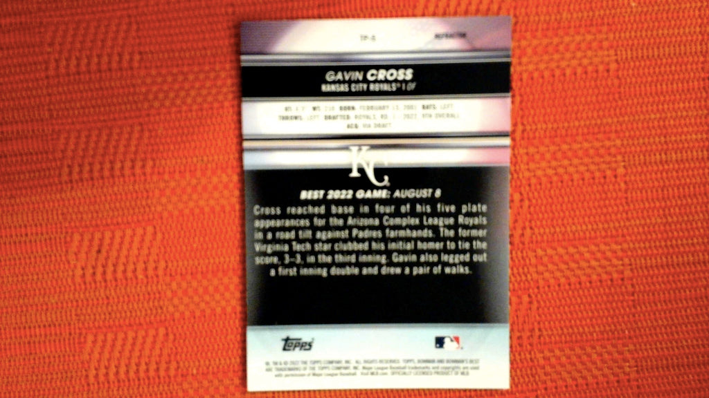 This is a nice example of a 2022 Bowman's Best #TP-5 Gavin Cross Top Prospects Refractor.