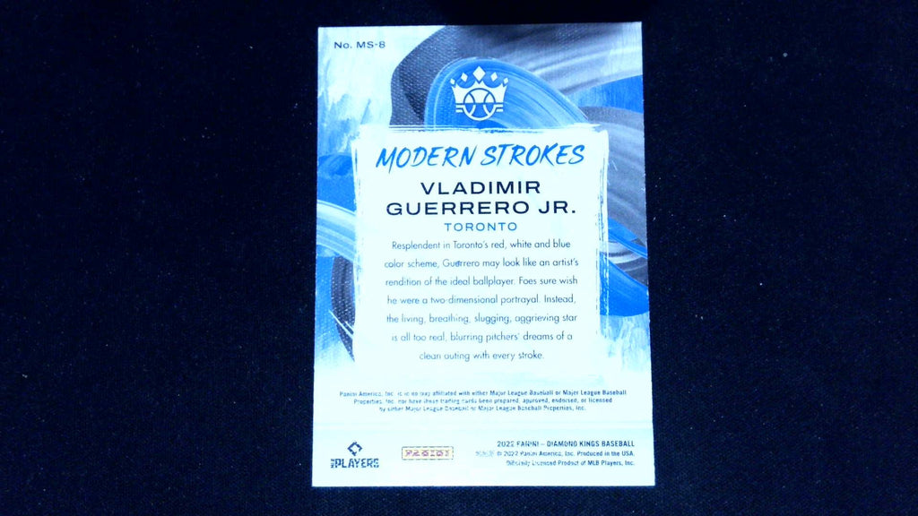 This is a nice example of a 2022 Panini Diamond Kings #MS-8 Vladimir Guerrero Jr. Modern Strokes.