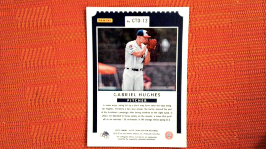 This is a nice example of a 2022 Panini Elite Extra Edition #CTO-13 Gabriel Hughes College Tickets Optic.