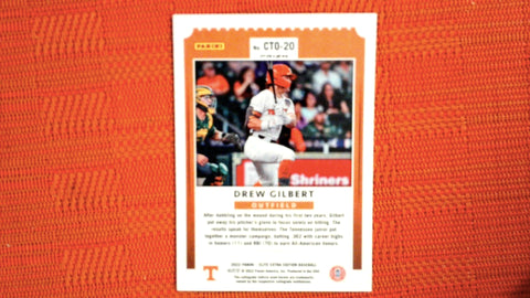 This is a nice example of a 2022 Panini Elite Extra Edition #CTO-20 Drew Gilbert College Tickets Optic Holo.