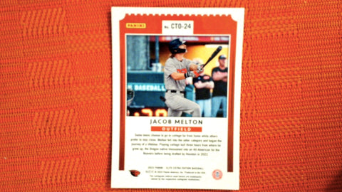 This is a nice example of a 2022 Panini Elite Extra Edition #CTO-24 Jacob Melton College Tickets Optic.