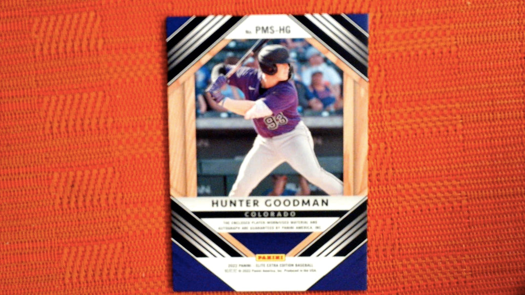 This is a nice example of a 2022 Panini Elite Extra Edition #PMS-HG Hunter Goodman Prospect Materials Signatures.