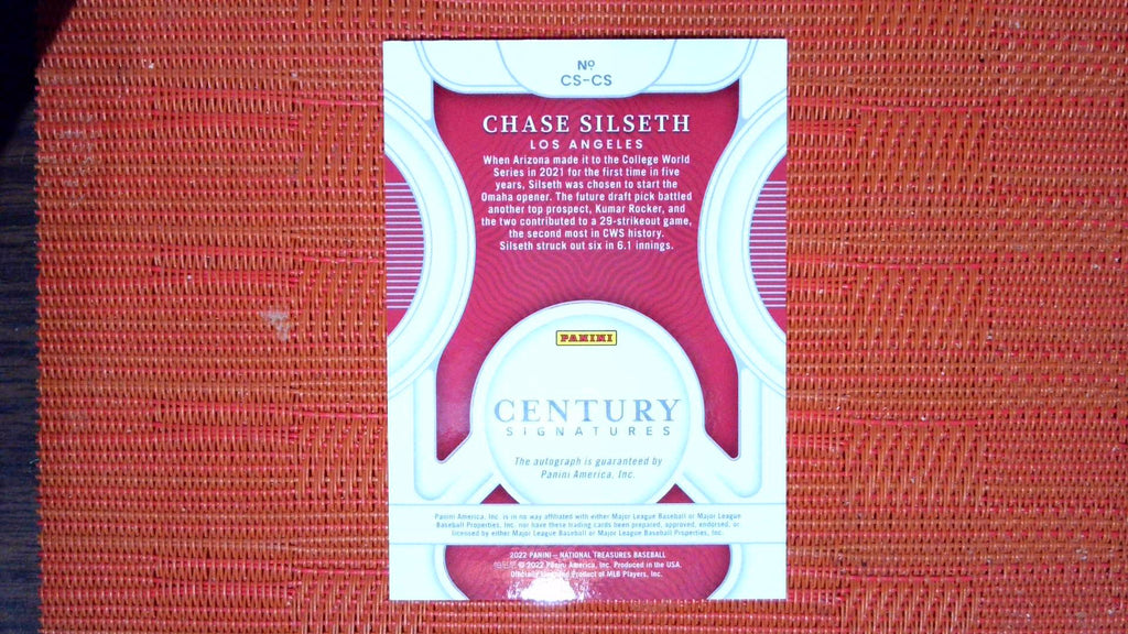 This is a nice example of a 2022 Panini National Treasures #CS-CS Chase Silseth Century Signatures.