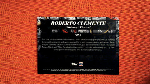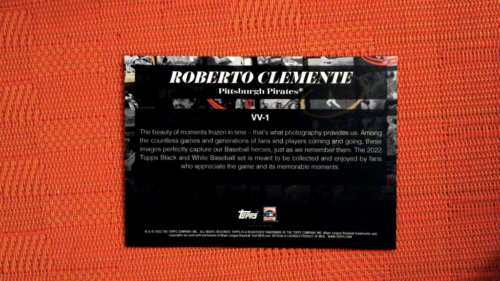 This is a nice example of a 2022 Topps Black & White #VV-1 Roberto Clemente Vintage Vantage.