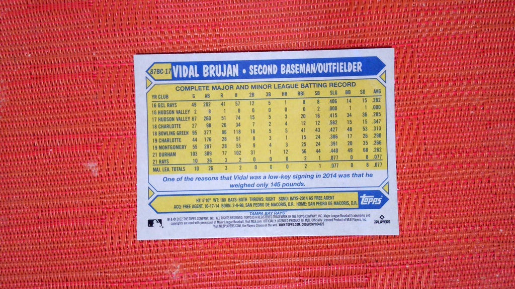 This is a nice example of a 2022 Topps Chrome #87BC-17 Vidal Brujan 1987 Topps Baseball.