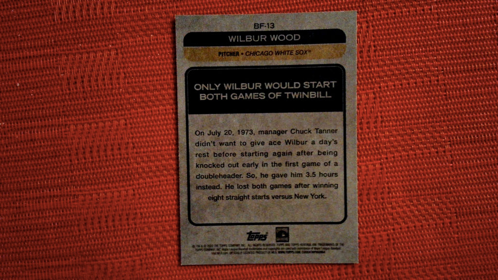 This is a nice example of a 2022 Topps Heritage #BF-13 Wilbur Wood Baseball Flashbacks.