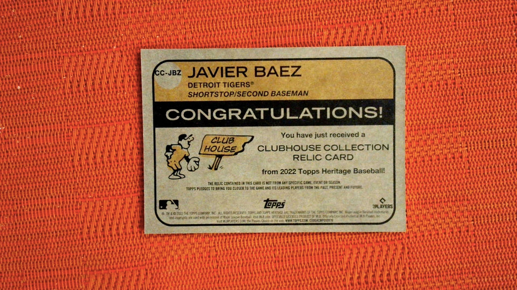 This is a nice example of a 2022 Topps Heritage #CC-JBZ Javier Baez Clubhouse Collection Relics.
