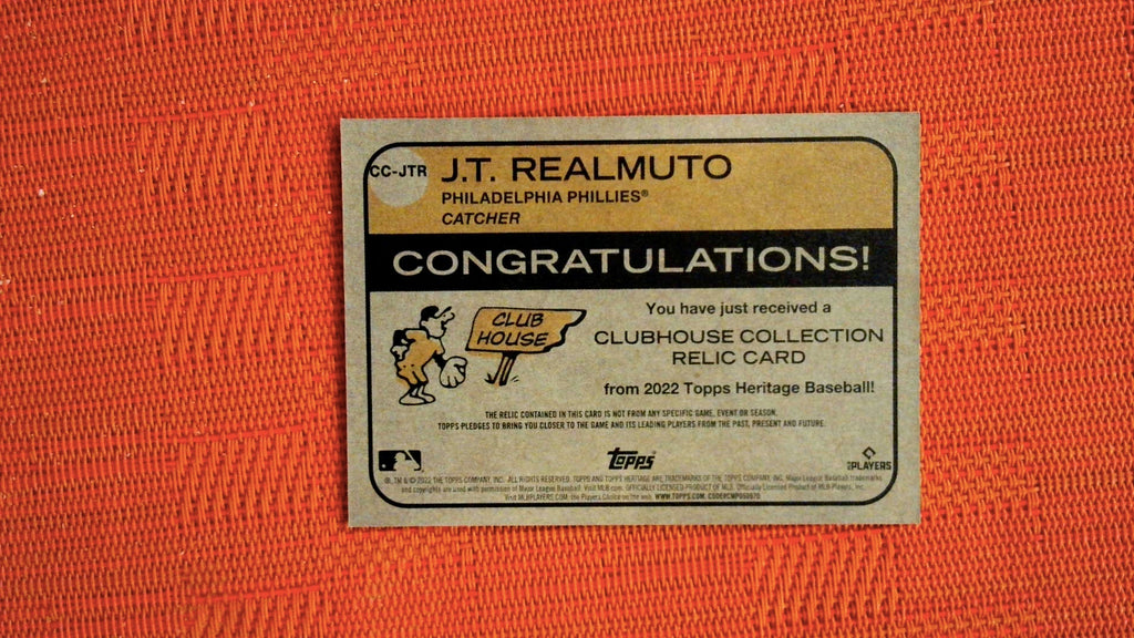 This is a nice example of a 2022 Topps Heritage #CC-JTR J.T. Realmuto Clubhouse Collection Relics.