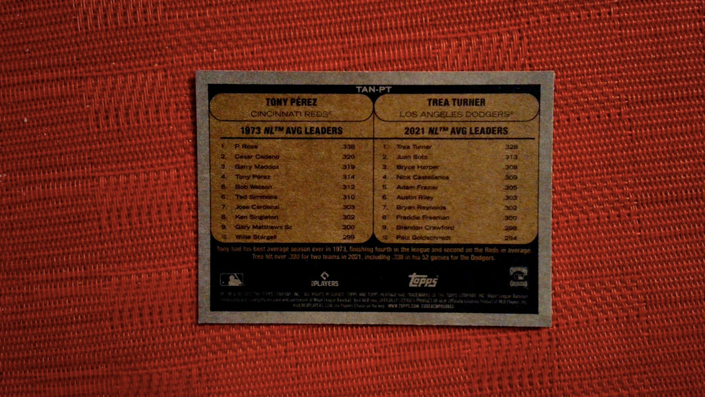 This is a nice example of a 2022 Topps Heritage #TAN-PT Tony Pérez / Trea Turner Then and Now.