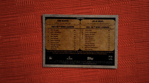 This is a nice example of a 2022 Topps Heritage #TAN-SU Tom Seaver / Julio Urias Then and Now.