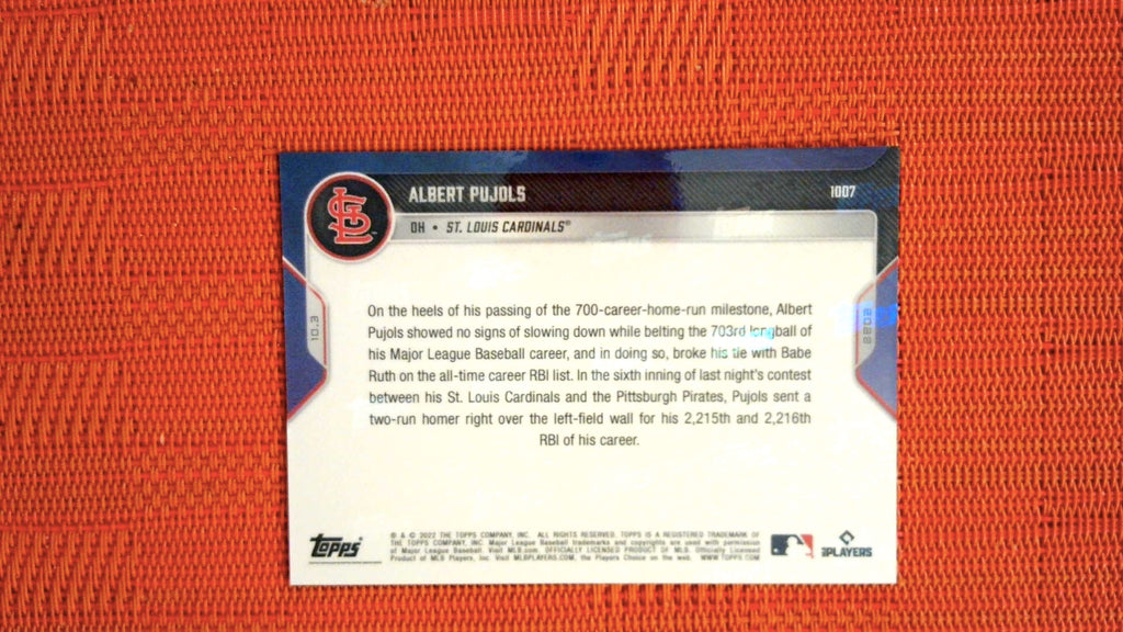 This is a nice example of a 2022 Topps Now #1007 Albert Pujols - Passes Babe Ruth for 2nd on All-Time RBI List .
