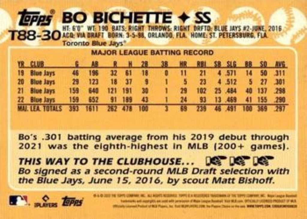 This is a nice example of a 2023 Topps #T88-30 Bo Bichette 1988 Topps Baseball 35th Anniversary (Series One).