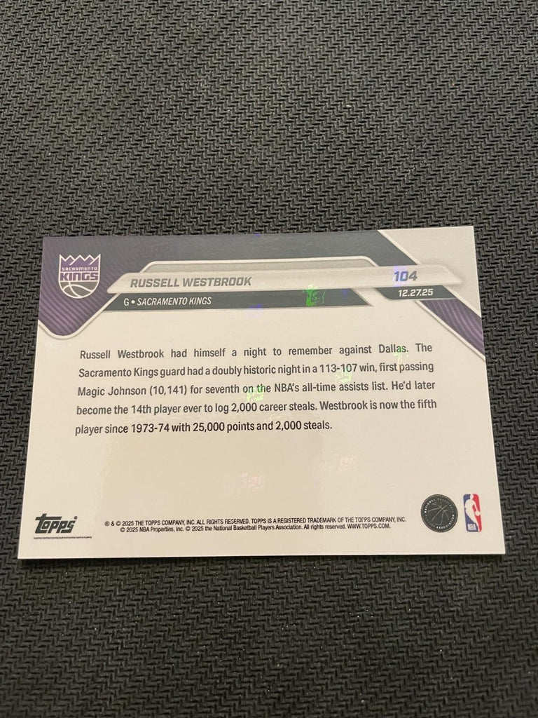 This is a nice example of a 2025-26 Topps Now #104 Russell Westbrook Gold Foil.