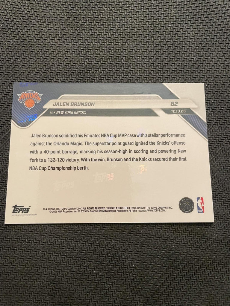 This is a nice example of a 2025-26 Topps Now #82 Jalen Brunson Gold Foil.