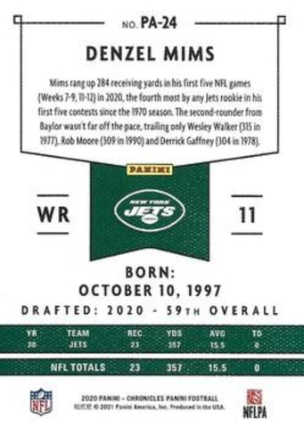 This is a nice example of a 2020 Panini Chronicles #PA-24 Denzel Mims Panini.