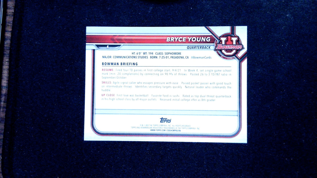 This is a nice example of a 2021-22 Bowman University #4 Bryce Young .