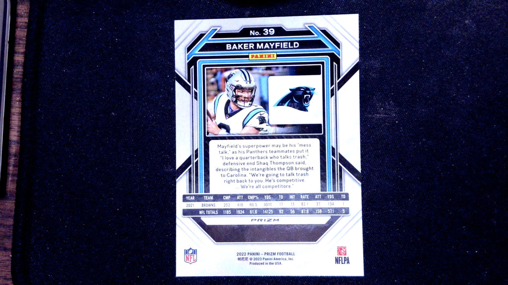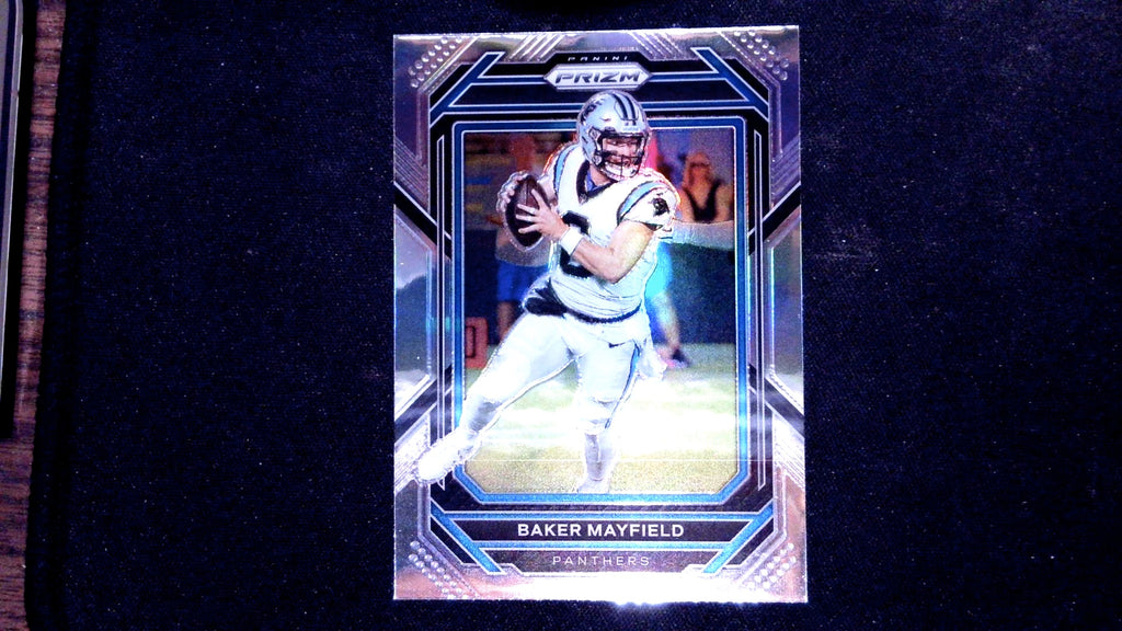 This is a nice example of a 2022 Panini Prizm #39 Baker Mayfield Silver.
