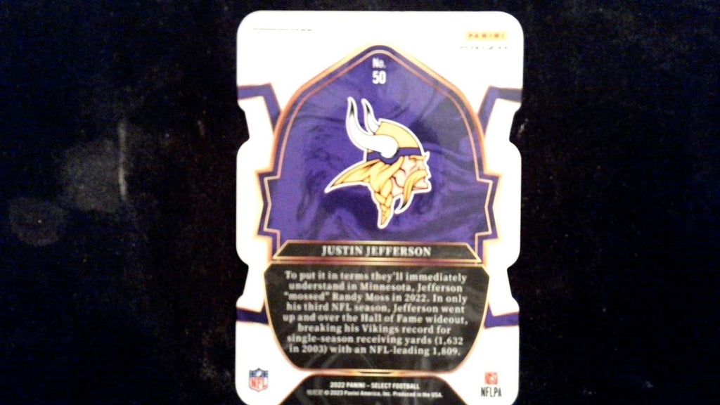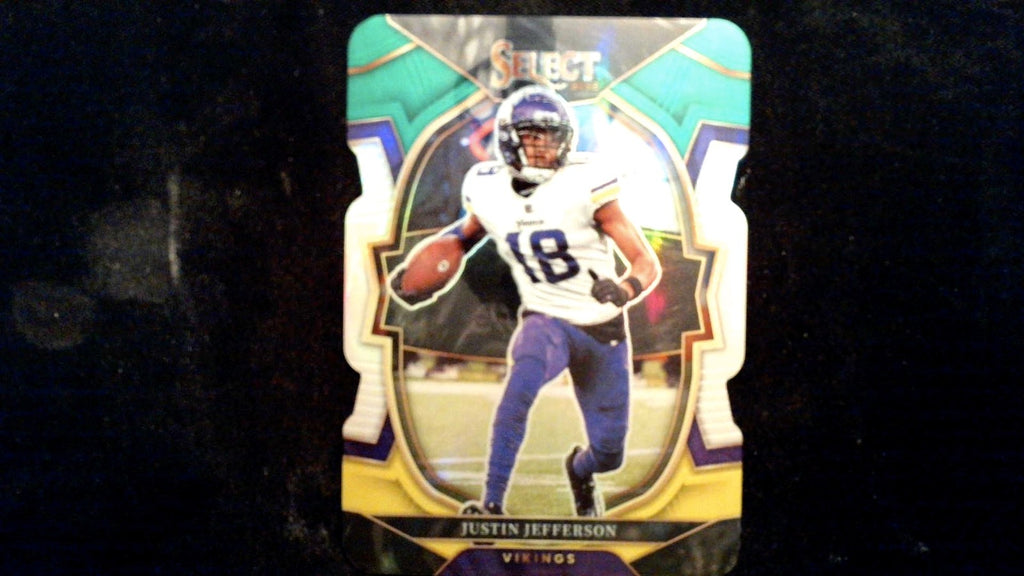 This is a nice example of a 2022 Panini Select #50 Justin Jefferson Green and Yellow Prizm Die Cut.