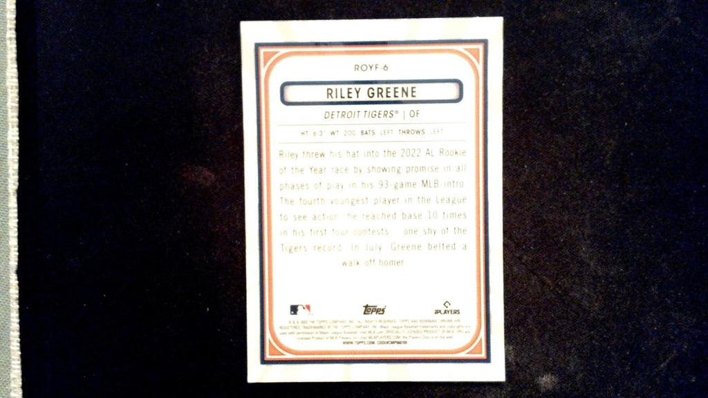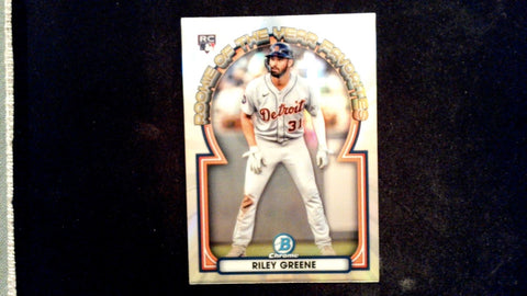 This is a nice example of a 2023 Bowman #ROYF-6 Riley Greene Rookie of the Year Favorites. The card is right out of the pack. We will combine shipping. Sales tax is applied to Maryland residents. Free shipping orders less than $20 will be shipped PWE.Other important information about this card: In 2023 Riley Greene played for the Detroit Tigers.Please check out our other listings for more great cards.