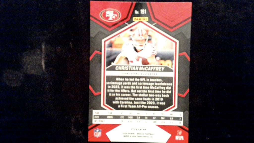 This is a nice example of a 2024 Panini Mosaic #191 Christian McCaffrey Mosaic Reactive Blue.