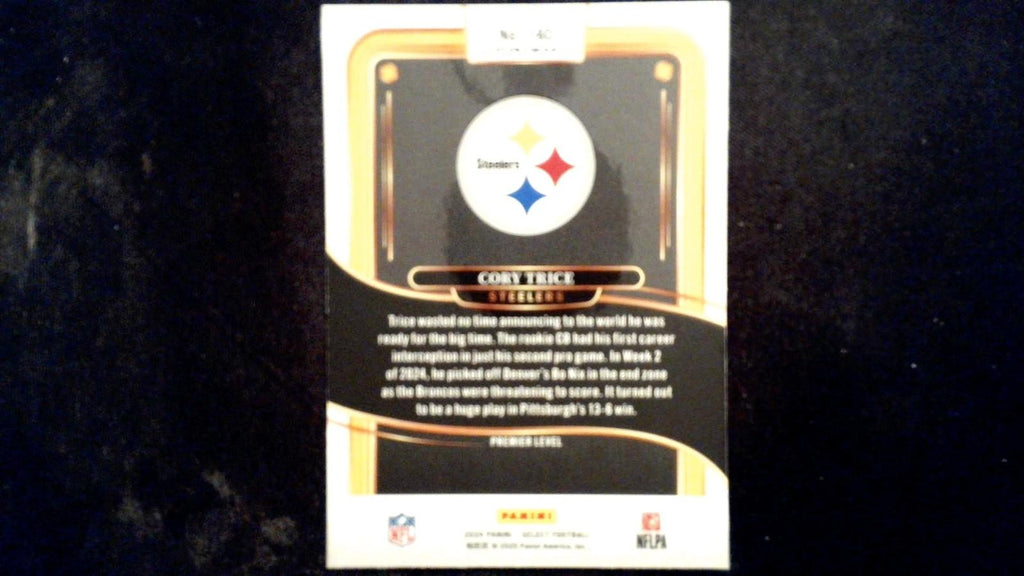 This is a nice example of a 2024 Panini Select #140 Cory Trice Black & Green Prizm Shock.