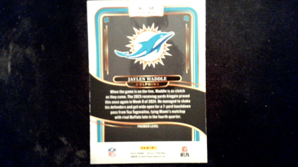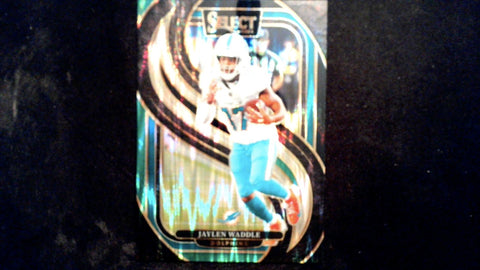 This is a nice example of a 2024 Panini Select #168 Jaylen Waddle Black & Green Prizm Shock.