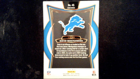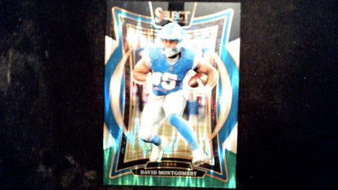 This is a nice example of a 2024 Panini Select #45 David Montgomery Black & Green Prizm Shock.
