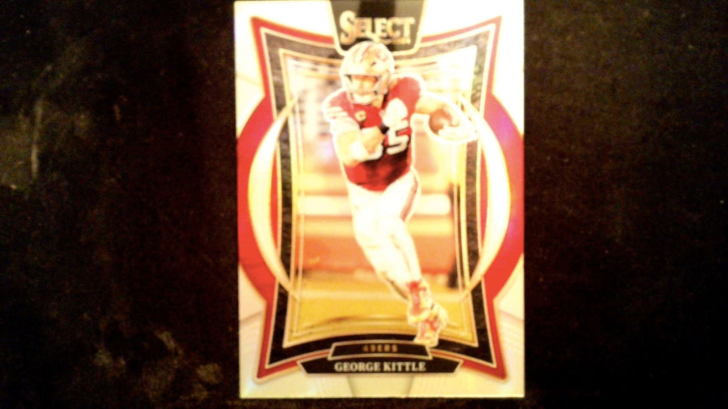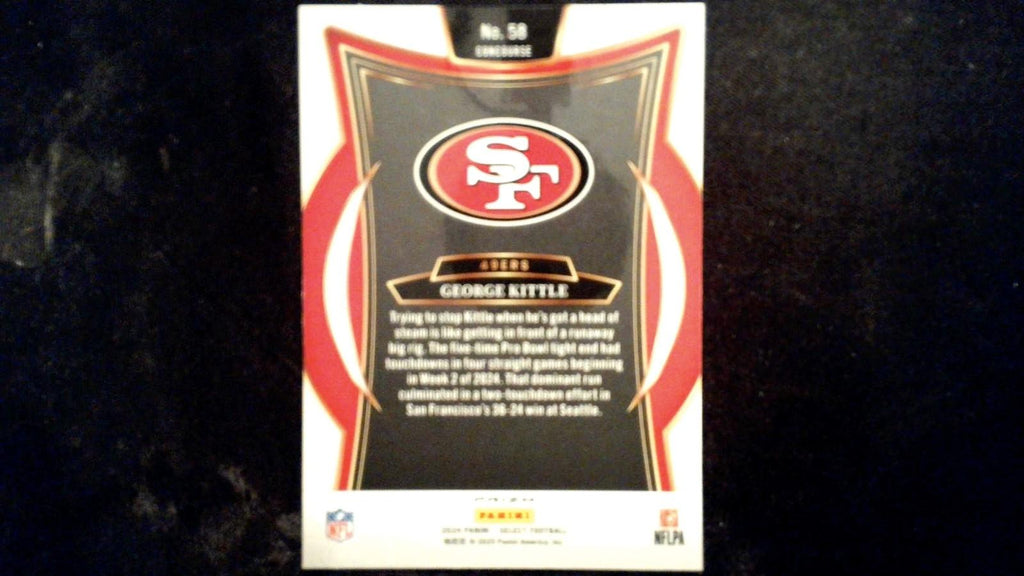 This is a nice example of a 2024 Panini Select #58 George Kittle Silver Prizm.