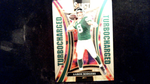This is a nice example of a 2024 Panini Select #8 Aaron Rodgers Turbocharged.