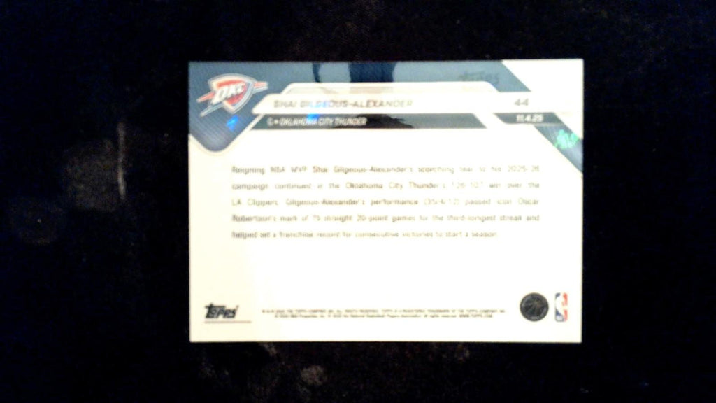 This is a nice example of a 2025-26 Topps Now #44 Shai Gilgeous-Alexander Orange Foil.