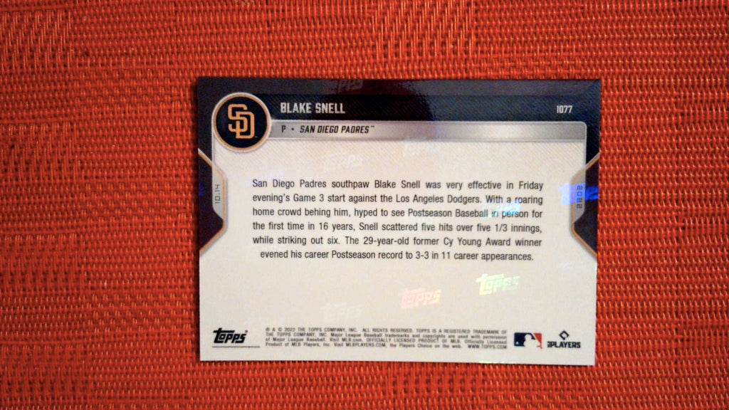 This is a nice example of a 2022 Topps Now #1077 Blake Snell - Lefty Keeps Dodgers Batters Guessing in Victory Purple.