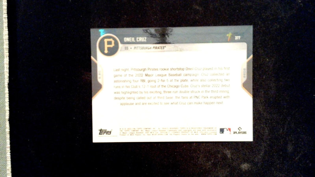This is a nice example of a 2022 Topps Now #377 Oneil Cruz . The card is right out of the pack. We will combine shipping. Sales tax is applied to Maryland residents. Free shipping orders less than $20 will be shipped PWE.Other important information about this card: In 2022 Oneil Cruz played for the Pittsburgh Pirates.Please check out our other listings for more great cards.