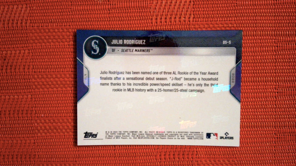 This is a nice example of a 2022 Topps Now Off-Season #OS-5 Julio Rodriguez Red.