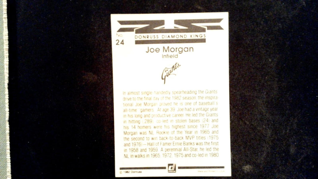 This is a nice example of a 1983 Donruss #24 Joe Morgan . The card is right out of the pack. We will combine shipping. Sales tax is applied to Maryland residents. Free shipping orders less than $20 will be shipped PWE.Other important information about this card: In 1983 Joe Morgan played for the San Francisco Giants.Please check out our other listings for more great cards.