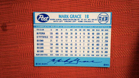 This is a nice example of a 1991 Post Cereal #22 Mark Grace .