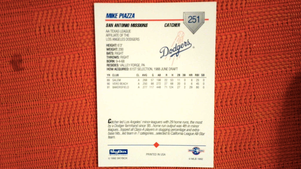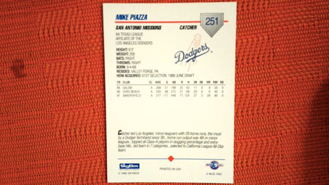 This is a nice example of a 1992 SkyBox Team Sets AA #573 Mike Piazza .