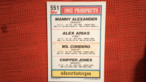 In 1992 Manny Alexander / Alex Arias / Wil Cordero / Chipper Jones TP played for the Baltimore Orioles / Chicago Cubs / Montreal Expos / Atlanta Braves.