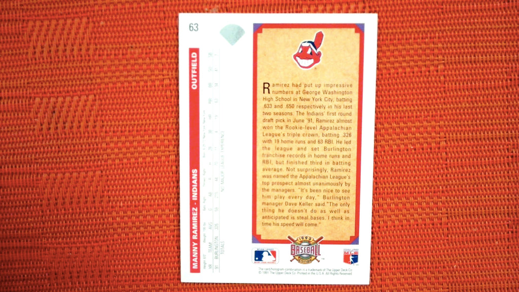 This is a nice example of a 1992 Upper Deck #63 Manny Ramirez .