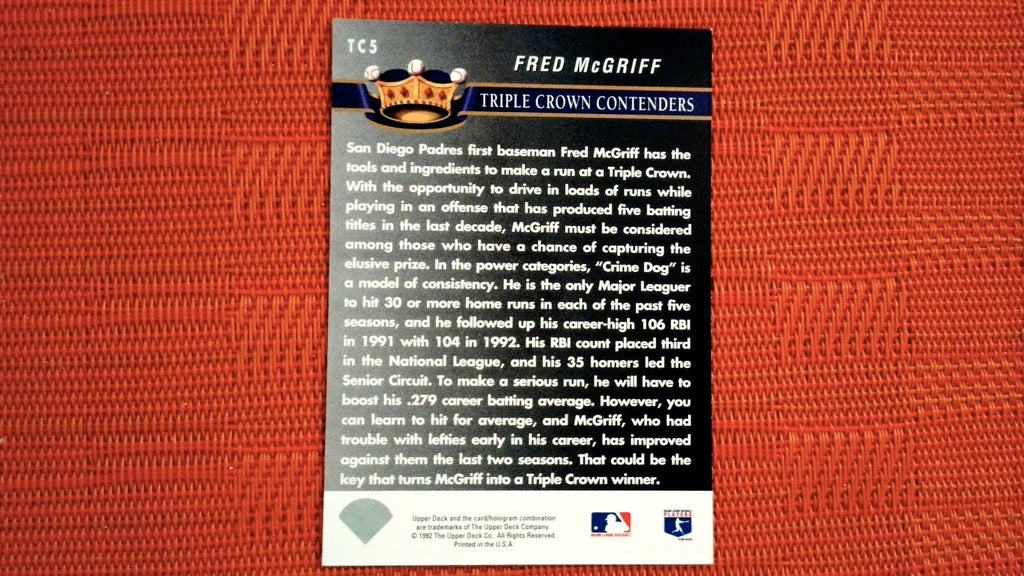 1992 Upper Deck Insert #TC5 Fred McGriff Triple Crown Contenders Baseball